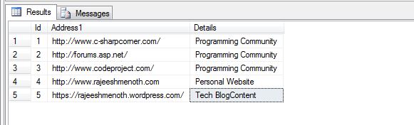 The given table contains incorrect address in the "Address1" column like httpp://www.c-sharpcorner.com/, so http is appended with an extra p ("httpp"). So we can update those values in a single query. How ? Microsoft SQL Server provides Replace function to replace particular data.