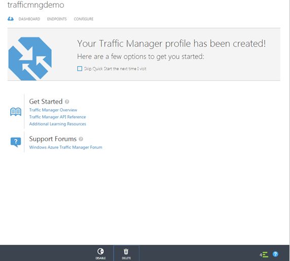 Once you select the appropriate load balancing method, click on the “create” button. It will create a Traffic Manager service for you. For reference see the following screen.