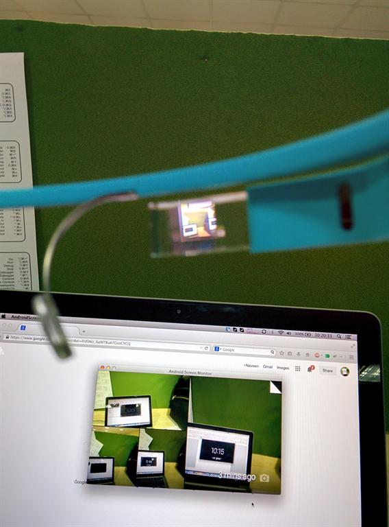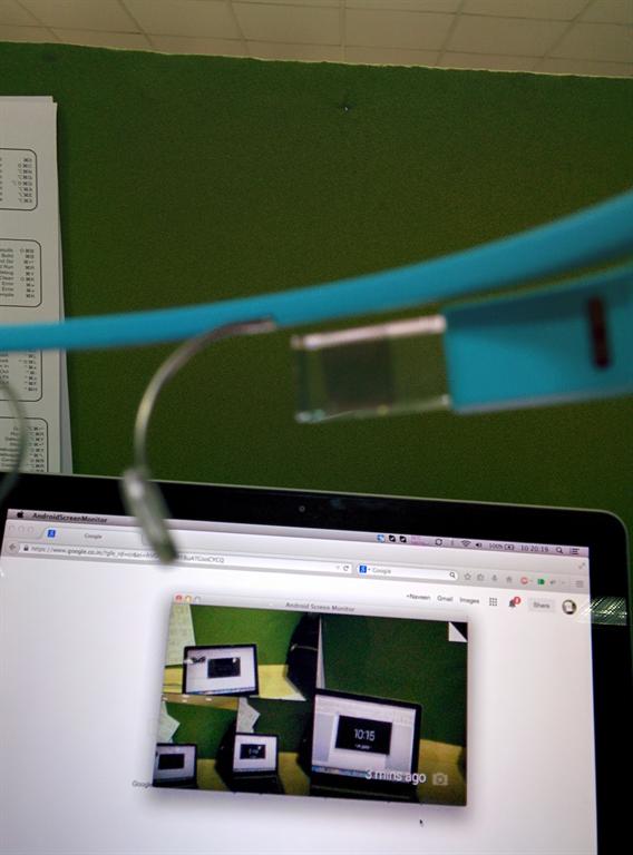 The great thing about glass is that it's not in your way like a smartphone, this is what the user looks at when using Google Glass. The left one is when the screen is off, you woudn't notice that it is there and the right one is when the screen is on, looks small here but when it is near your eye, its like a small TV on top of your right eye.