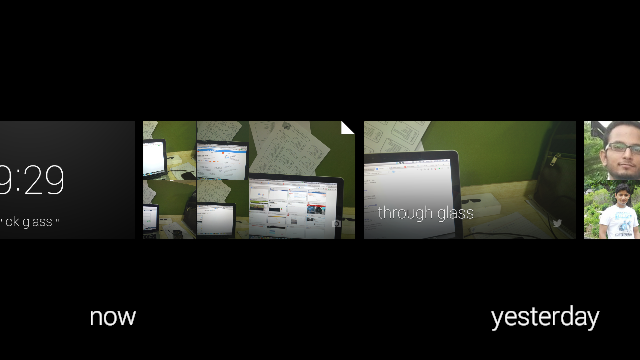 The UI of Google Glass is a horizontally scrollable list, that is called a Timeline. Scrolling is done through the touch pad on the right side of the Glass. The Timeline consists of cards arranged in chronological order from the oldest being on the right end. Every card is information-based like picture, video, Tweet, mail, call, message and so on. Like let's say you subscribe to Twitter notifications on glass, so whenever a notification/Tweet comes it will be inserted into the timeline as a card. I will not get into the technical details right now but check out the following screen shots to get an idea of the UI.
