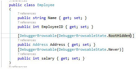 To use the preceding attributes you need to use the System.Diagnostics namespace. If you want to customize the view on the debugger window for any properties during debugging you can easily do that using DebuggerBrowsable attributes. You can apply DebuggerBrowsable attributes for any properties, fields or for Indexer. The DebuggerBrowsable attributes constructor takes DebuggerBrowsableState as an argument. DebuggerBrowsableState is used to provide the instruction to the debugger of how to display it in the debugger window.