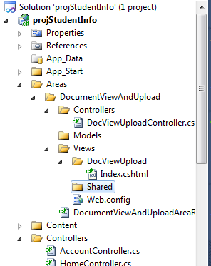 This is a very simple article to upload and view documents using MVC and Ajax. Sometimes a user needs to upload file(s) to the server and view. For example, if you want to upload photos, PDF documents, text files and so on. This article shall help you to upload and view documents in a browser at the same time. Here I have created an Area (right-click on ProjectName (projStudentInfo) > add > Area) > Enter Area Name (DocumentViewAndUpload).