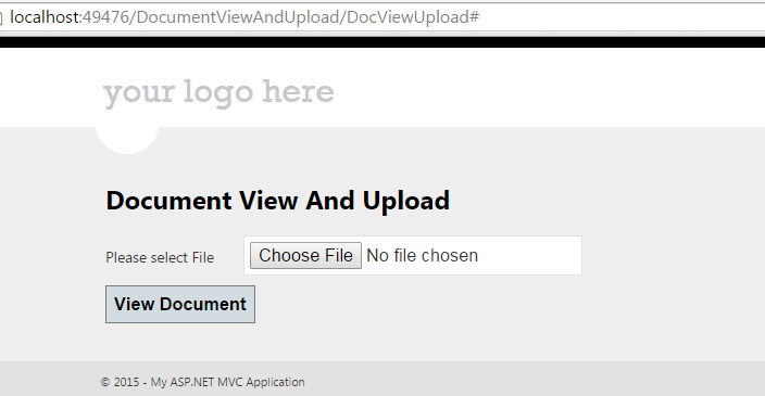 In the preceding code we have an Index action and Index action with a HttpPostedFileBase parameter. On the click of the button a parameterized Index will be called. The code will copy a file to the “File” folder and the JSON result is returned to view the jQuery. JSON returns the filename to jQuery that then calls ShowDocument with file name as parameter. We have the GetMimeType function that returns ContentType as a string.