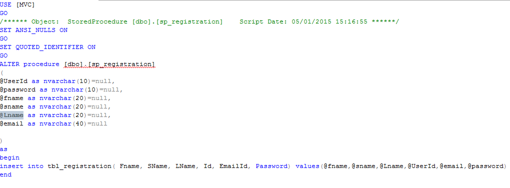 From here we retrieve a seperate seperate property and then send it to a method in the model called Registration1. From registration1 it will add the value to the Stored Procedure and execute.
