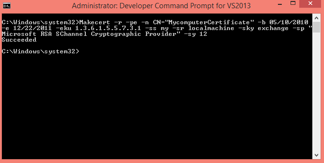 Makecert -r -pe -n CN="MycomputerCertificate" -b 05/10/2010 -e 12/22/2011 -eku 1.3.6.1.5.5.7.3.1 -ss my -sr localmachine -sky exchange -sp "Microsoft RSA SChannel Cryptographic Provider" -sy 12