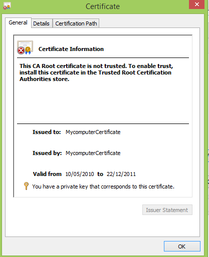 - CN specify the Certificate name. Here the certificate name is "MycomputerCertificate".