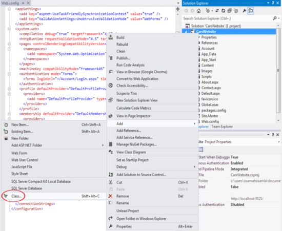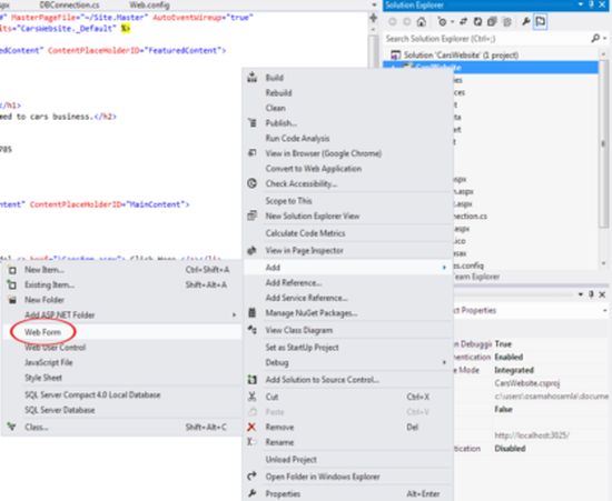 Add Function to DBConnection class to retrieve Cars table dataOpen the DBConnection class. From the Solution Explorer double-click on DBConnection.cs to open it. Add the following headers.