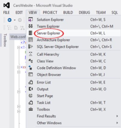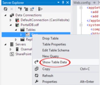 From the Server Explorer, right-click on the Cars table and select Show Table Data as shown in the following figure.
