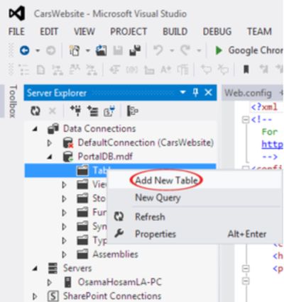 Then go to Server Explorer then expand the database then right-click on Tables then select Add New Table.