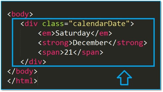 The following is the template that I will be modifying to get the desired output. It contains a main wrapper Div and three elements inside for Day, Month and Date respectively. I had the option to put all the three in a span but just to reduce the complexity of the CSS I put them in separate tags.