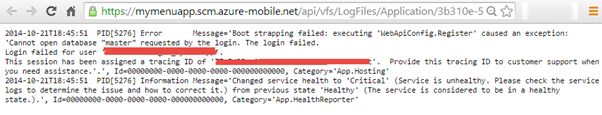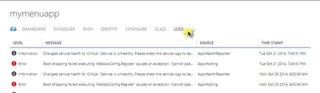 In Azure Portal, each Azure Mobile Service has a separator that shows all the logs registered (Figure 1), and if possible to see the details for each one (Figure 2):