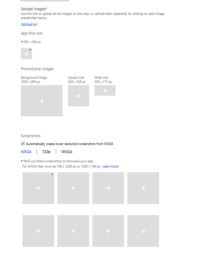 Before going to the Dev Center to submit the app, we should prepare all the artwork. The screenshots are taken, the app title icon with 300x300 should be created and if necessary create the background image with 1000x800, square icon with 358x358 and wide icon with 358x173.