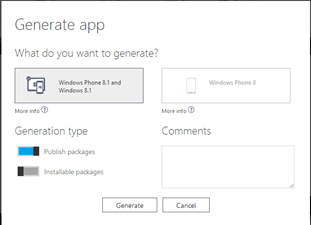 After a save all, it's time to generate the app. To do that, click on Finish and then Generate. Now we need to choose Publish Packages, to create the packages for the Store.