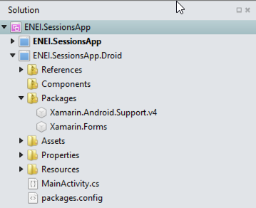 - ENEI.SessionsApp.Droid: Xamarin Android project that defines the Android application and knows the Android API.