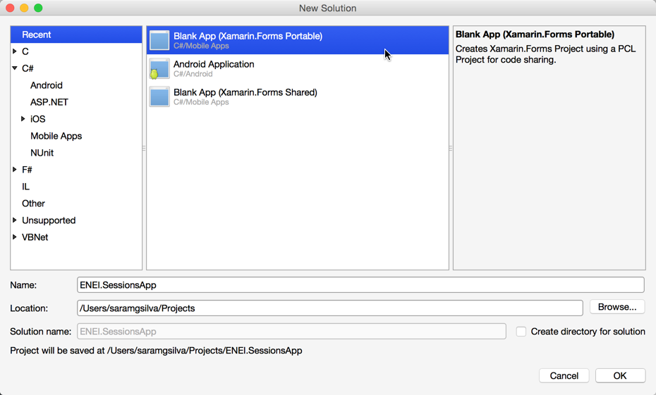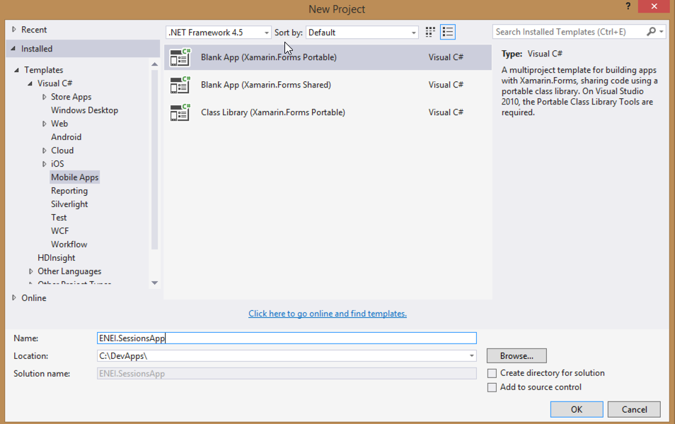 And then create a new Blank App (Xamarin Forms Portable), as in the following: