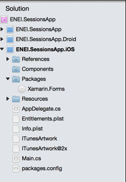 - ENEI.SessionsApp.iOS Xamarin iOS project that defines the iOS application and knows the iOS API.