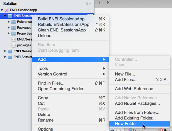 3.1. Create the XAML pageIn Xamarin Studio, select the ENEI.SessionsApp project and create a folder called “Views”, as described in Figure 1 and Figure 2.