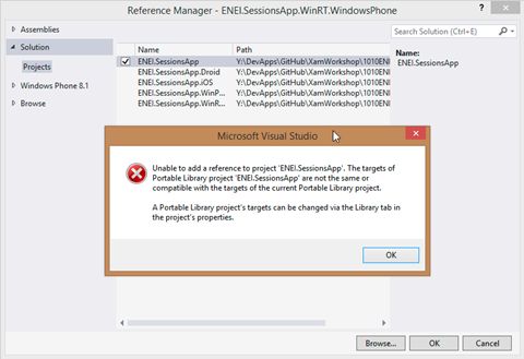 This error means that the ENEI.SessionsApp is a Portable Class Library (PCL) that does not have support for Windows Phone 8.1 (WinRT). This way, you need to change the PCL project (in Properteis) to support this target, as described in Figure 6: