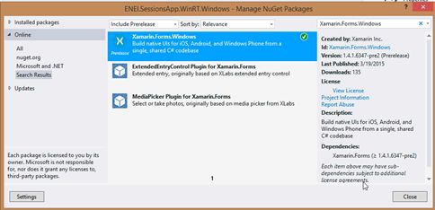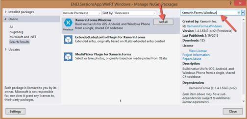 Before you create code, you need to install the Xamarin Forms Windows (Preview) NuGet Package as in the following: