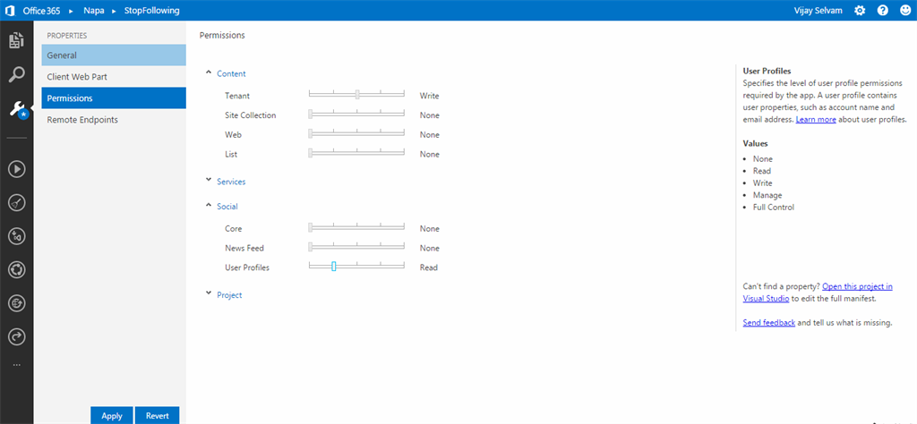 - Choose the App for SharePoint template, name the project and then click the Create button