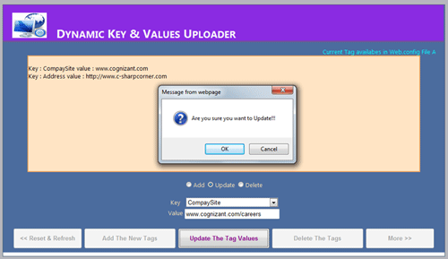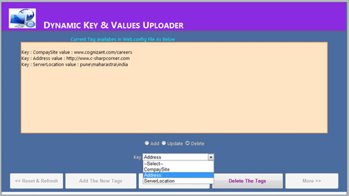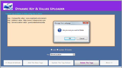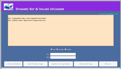 This is simple and useful application for those who wants dynamic changes in the web.config file. The sample source code allows you to change the key and value pair. There is no need to open web.config file. The application also allows you to update and delete the key/value pair.