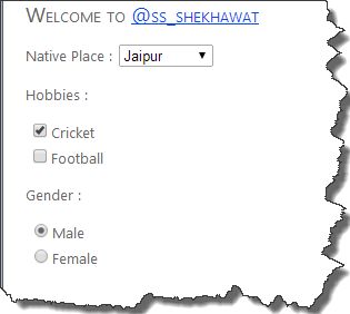 Now design a form that has three lists for NativePlace (Dropdownlist), Hobbies (Checkbox list) and Gender (Radio button list) as in the following code snippet.