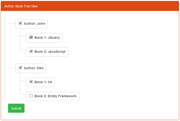 - When all child book nodes are selected for a parent author node then the parent node will be selected.