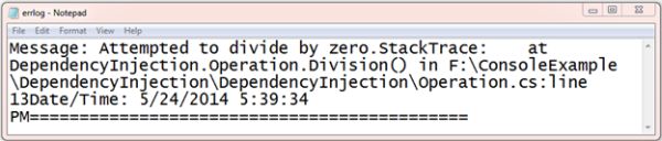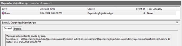 To understand the concept of Dependency Injection, create an example that is the Error Log Management. The Error Log Management example describes how to create an error log for the application. There are two types of log management, one is using a text file and the other is uses an event viewer.