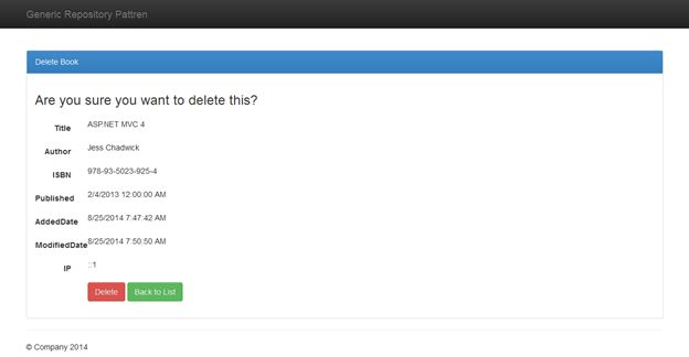 Delete a book is the last operation of this article. To delete a book we follow the process of clicking on the Delete button that exists in the Book listing data then the book detail view shows to ask “You are sure you want to delete this?” after clicking on the Delete button that exists in the Delete view such as in Figure 1.8. When we click the Delete button of the book list then it makes a HttpGet request that calls the DeleteBook() action method that shows a delete view then clicks on the Delete button of the view then an HttpPost request makes that call to ConfirmDeleteBook() action methods that delete that book.