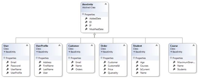 As in the preceding class diagram the BaseEntity class is a base class that is inherited by each other class. Each derived entity represents each database table. We will use two derived entities combination from the left side to explain each relationship type and that's why we create six entities.