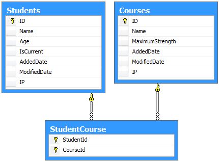 The code snippet above shows that one student can join many courses and each course can have many students. As you know, to implement Many-to-Many relationships we need a third table named StudentCourse. The MapLeftKey() and MapRightKey() methods define the key's name in the third table otherwise the key name is automatically created with classname_Id. The Left key or first key will be that in which we are defining the relationship.