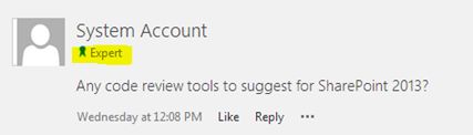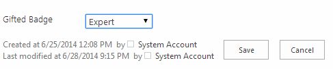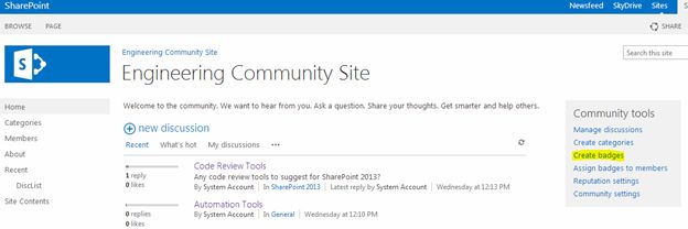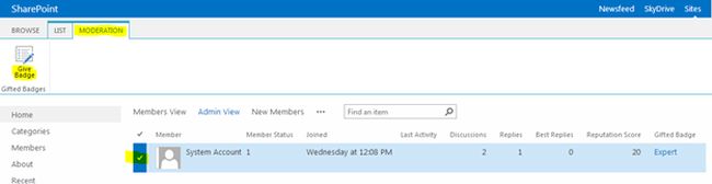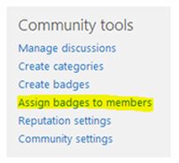 If you found a contributor with good answering skills, you can assign him the badge above. The badge appears with a special icon as shown below.Create a BadgeAs the first step we need to create a badge. For this open the Community site choose the Create Badges option.You will get the following list. Choose the New link to create a badge.Assign a BadgeAfter creating the badge, we can assign it to a contributor. Choose the Assign badges to the members link from the home page of the community site.In the page that appears, check the member, choose the MODERATION tab and click the Give Badge option.Choose the badge and click the Save button.Test the BadgeBack to the home page, choose a discussion item and you can see the badge being assigned over there.The badge will continue to appear in all the answers or replies for the user.Note: Please note that the SharePoint list is the underlying storage for Badge items.Referenceshttp://technet.microsoft.com/en-us/library/jj219805(v=office.15).aspx SummaryIn this article we explored how to use badges in a community site.