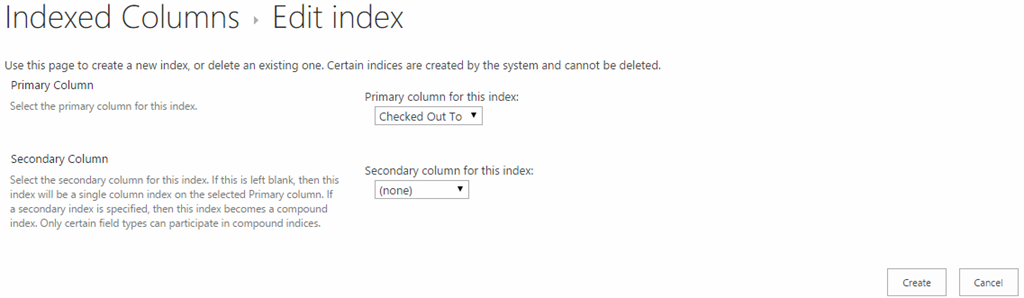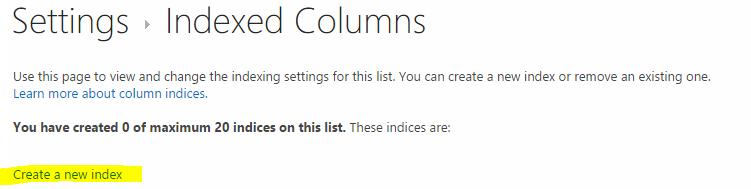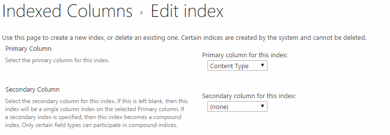 Indexing at the list or library level will be applied to the database tables too. This helps to increase the retrieval speed, especially for the WHERE condition fields.Improving performance is required when the list view threshold has reached, for example, a list with more than 5000 items.Create Indexed ColumnsTo create indexed columns for a list or library use the following procedure.Open the List Settings Page.Figure 1: Open List setting PageScroll down and click on the Indexed Columns link.Figure 2: Indexed ColumnsYou will get the following page.Figure 3: Setting Indexed ColumnsClick on the Create a new index link. You will get the following page.Figure 5: Edit IndexPlease note that SharePoint does not allow all column-types to be indexed. See the references section for more information.You can choose the column for indexing. For the time being, I have chosen Content Type.Figure 5: Content typeThe changes will be saved automatically. You can add up to 20 indexed columns.Database IndexIf you have examined a SharePoint Content Database Table structure, you will understand that SharePoint stores a record in multiple rows in the AllItems table. This table also contains records (items) from various lists. So you might have the concern that Adding an Index can impact other List items too!Explanation This case won't happen since once a column is indexed, the data will be stored in a new table. So whenever we are adding indexed columns, a new database column will be created in the background. The new database column will be indexed and thus provides better performance.Referenceshttp://bit.ly/1Fy3G0jSummaryIn this article we explored Indexed Columns.
