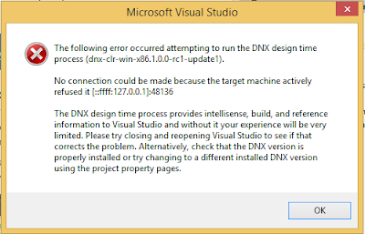 Today I thought to create my first demo using Visual Studio 2015 for ASP.NET Core 1.0. So, I opened VS2015 and chose Web Application template under ASP.NET 5 Templates. Visual Studio started creating a project for me. Although my project was created, at the same time a DNX error was thrown as shown below: