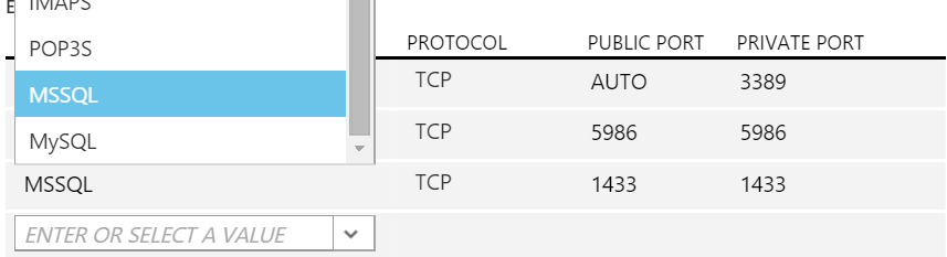 Step 7: Click enter or select a value and select MSSQL, a public port and private port (Endpoints) will be created for SQL Server.