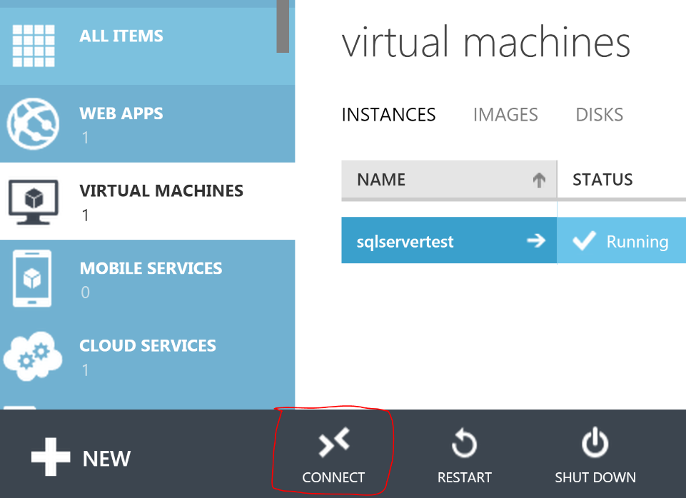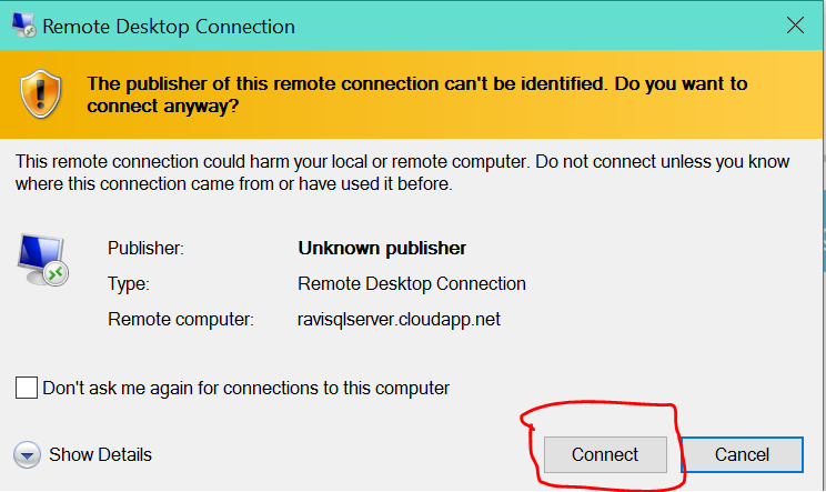 - Click on the connect button on the bottom bar of the selected VM. This will download a .rdp connection file for the VM.