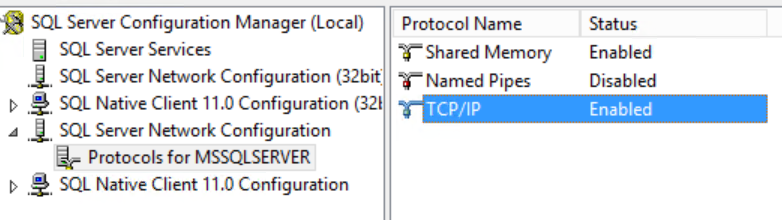 - Go to Protocols for MSSQLServer and check if TCP Port is enabled or not. If not right click on it and click on enable.