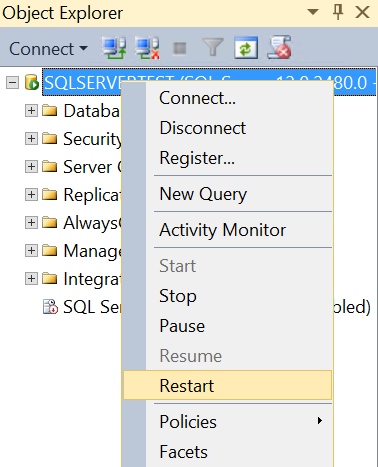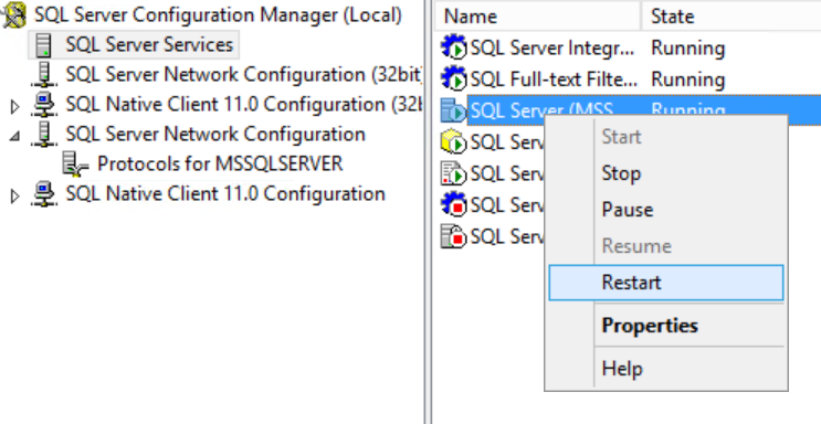 - Right click on SQL Server, click on Restart then click on Yes to restart the SQL Server.