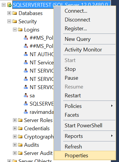 - Login with "Windows Authentication Mode" then right click on SQL Server and click on properties.