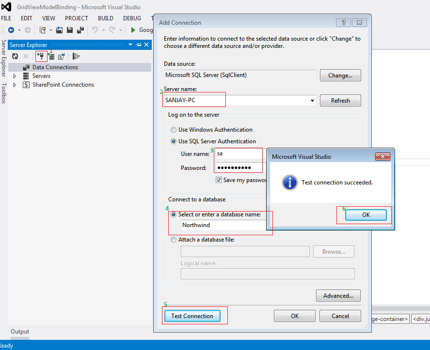 The first step is to create the database connection in Visual Studio. Open the Server Explorer window from the View menu and click the Connect to Database button and it will look as in the following.
