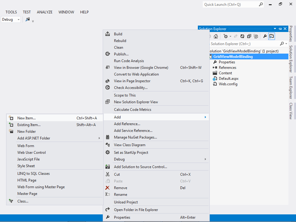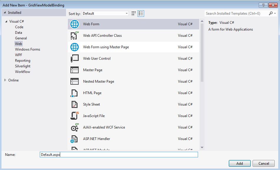 Now add a new item then select Web Form and leave Default.aspx as the name then click Add.
