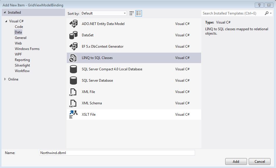 Northwind.dbml then click Add.