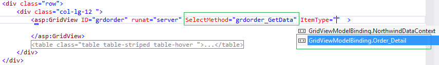 - runat="server" SelectMethod="grdorder_GetData" ItemType="GridViewModelBinding.Order_Detail">