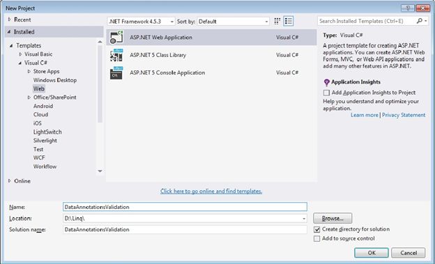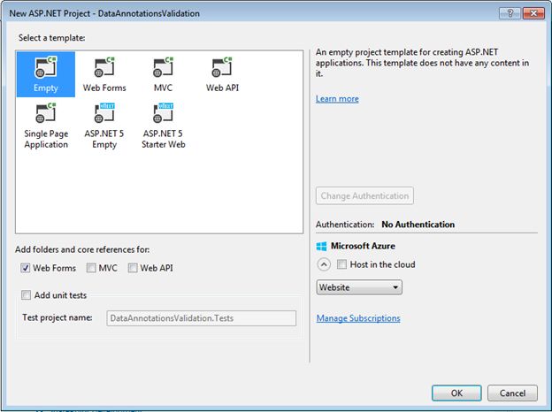 Create a new project using "File" -> "New" -> "Project..." then select web "ASP.NET Web Forms Application". Name it "DataAnnotationsValidation".