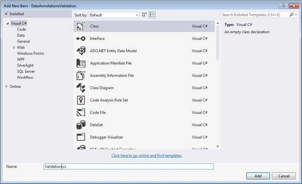 Now, do something with Add New Item then select Class then provide Validation.cs for the name then click on Add.