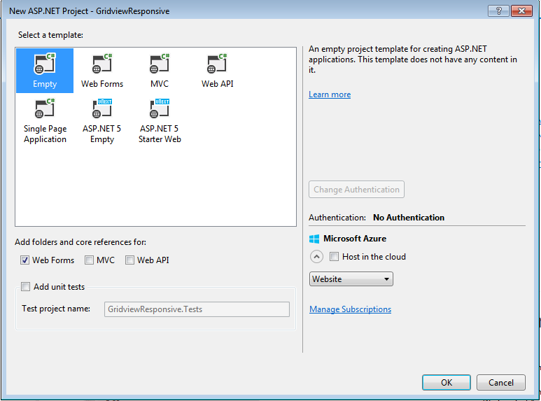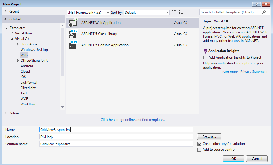 Create a new project using "File" -> "New" -> "Project..." then select Web then select "ASP.Net Web Forms Application". Name it “GridviewResponsive".