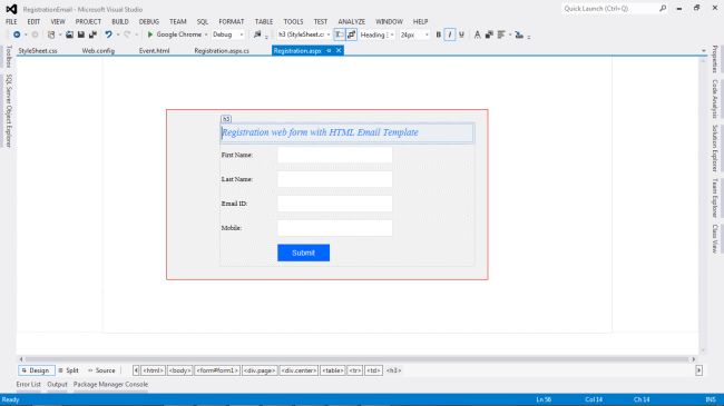 Step 5: Now in the design “Registration.aspx“ design the web page with the following source code. I have also implemented the JavaScript validations on the First Name, Last Name, Email ID and the Mobile fields.