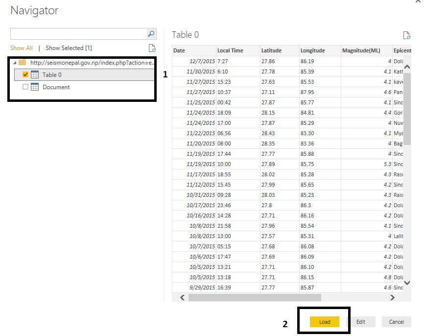 For this demo, I am analyzing the data from this link, which list the past earthquakes that has occurred in Nepal. Put in the URL and click OK.