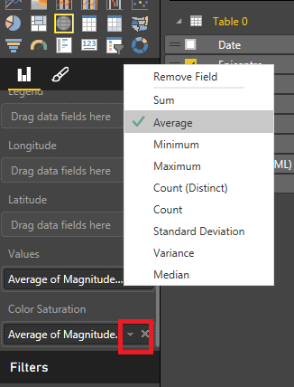 By default the sum of magnitude is taken. Change it to Average or any other measures you like by clicking on the small arrow on the side of the field. Do this for both Values and Color Saturation.