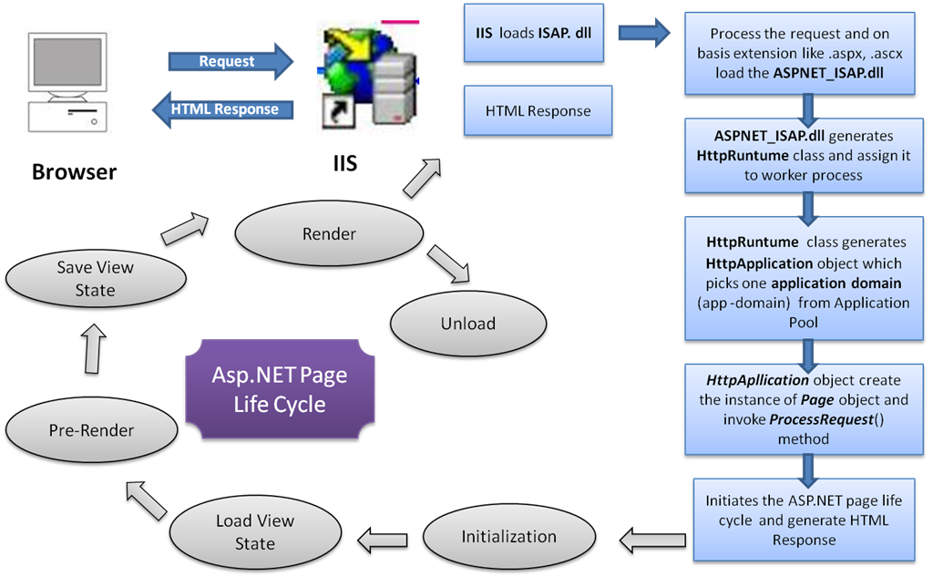First the client requests a page or resource from the browser. The request is passed to the IIS server. The IIS server starts the initial processing of the request and one of the basic extensions, like .aspx or .ascx, loads the "ASPNET_ISAP.dll". The ASPNET_ISAP.dll generates the "HttpRuntime" class and assigns it to the worker process. The HttpRuntime class generates a "HttpApplication" object and this object creates the instance of a "Page" object and invokes the ProcessRequest() method. This initiates the ASP.NET Page Life Cycle and generates the HTML Response.